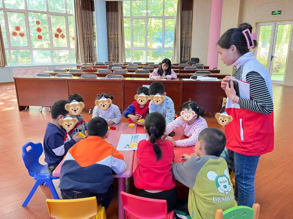 社工引导小朋友将手中的乐高积木拼搭成彩虹