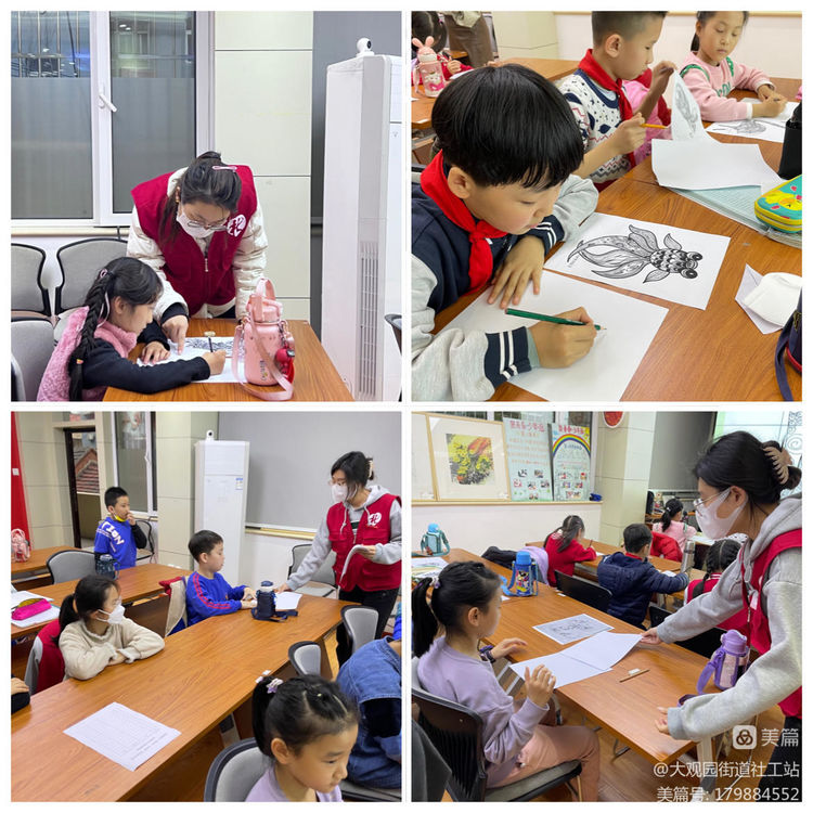 为了培养孩子的美术欣赏能力、绘画能力,通过美术训练,培养孩子的想象力和创新意识,增强孩子的自信心,激发他们内在的创造潜力。2022年11月10下午,大观园街道社工站联合睦和苑社区开展少儿绘画公益课堂活动。本次课堂邀请了国际少儿艺术教育——米雨薇老师、窦明琪老师前来授课。