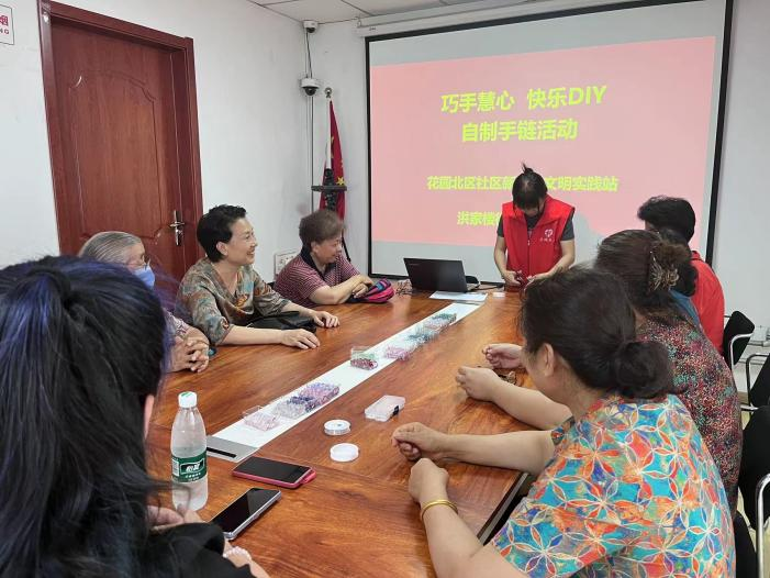 为了丰富社区老年人的文化生活,增强其动手能力,促进社区老年人邻里们的情感交流,7月26日上午,洪家楼街道社工站联合花园北区社区、洪家楼街道社区社会组织联合会共同开展“巧手慧心 快乐DIY”自制手链活动。