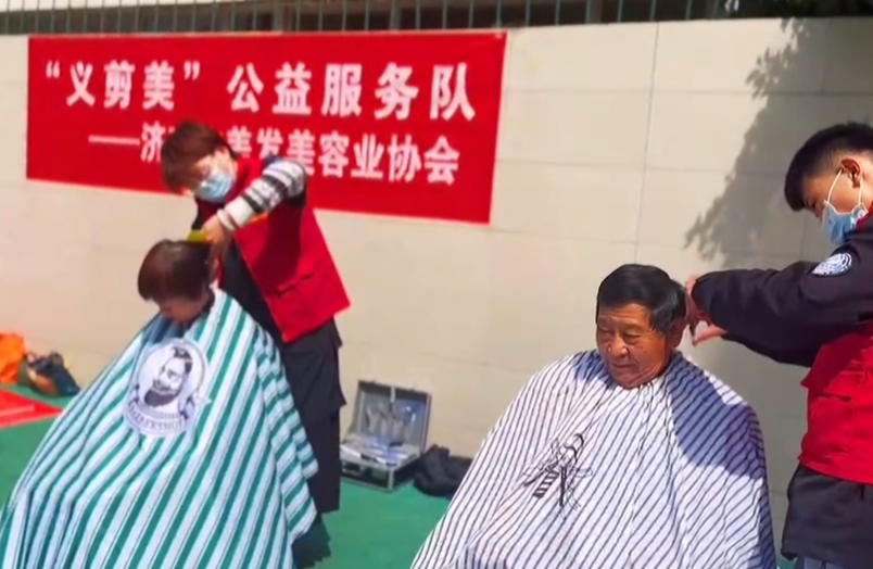 (公益理发小组志愿者帮助老人修剪头发)
