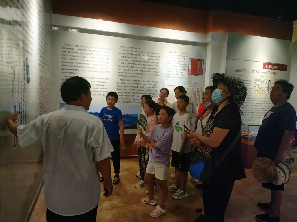 2022年8月12日,活动第三节开始,因为此次活动是户外活动,社工们与小组成员一起选出了小组的领导者,并邀请志愿及家长一起参与此次活动。随后社工站成员带领小组成员去齐长城遗址孟姜女民俗博物馆进行实地参观,感受古人的智慧,并有幸邀请孟姜女博物馆的管理者对齐长城、孟姜女的故事进行细致的讲解。小组成员在讲解员的带领下,沿着时间轨迹,了解齐长城千百年来的波澜壮阔和沧桑巨变。小组成员认真聆听解说员对孟姜女故事通俗易懂的讲解,细细观看孟姜女民俗博物馆内的文物展品和历史照片。活动结束时孩子们纷纷表示之前觉得无趣的东西变得生动,印象深刻,暑假生活原来除了手机也可以变得很多姿多彩。