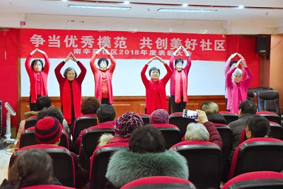 为更好地融入社区,宣传“槐荫社工”及项目组身份,项目组社工高度重视、积极参与、认真对待,与南辛苑社区对接活动内容及流程,主动承接了此次表彰会策划及主持环节,并邀请项目组老年活动中各康乐小组领袖及志愿者助演,合唱《共筑中国梦》、手语舞《国家》、集体舞《记得咱家》、太极八段锦、诗歌朗诵《美哉诗经》等,一段段悠扬的旋律、一个个曼妙的舞姿,很好地再现了“别样夕阳红”。会议开展期间,项目社工为项目组老年活动领袖颁发了“德艺双馨”奖项,肯定了他们一年来的参与和付出;与此同时,项目组也荣获了南辛苑社区“2018年度优秀社区志愿团队”荣誉称号,用实际行动彰显社工魅力。
