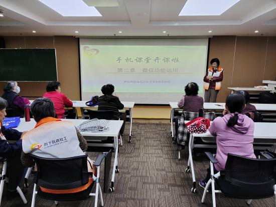 赋能培育再成长,镇静自若展风采。本期手机教学课堂的主讲人为杨松林老师。在手机课堂正式开始前,主动与社工站社工商讨课堂注意事项,核对活动流程。在授课过程中,杨老师沉稳镇静,耐心地启发和引导学员们,及时为学员们解疑答惑引领他们从微信功能使用的“茫茫迷雾”中走出来。从第一次上台讲课的生涩到现在对课堂把握的游刃有余,长者智能互助团在一步步实践中取得进步,不断成长,充分体现了社工站赋能培育工作的重要作用,同时也展现了社区社会组织的培育显著成效。