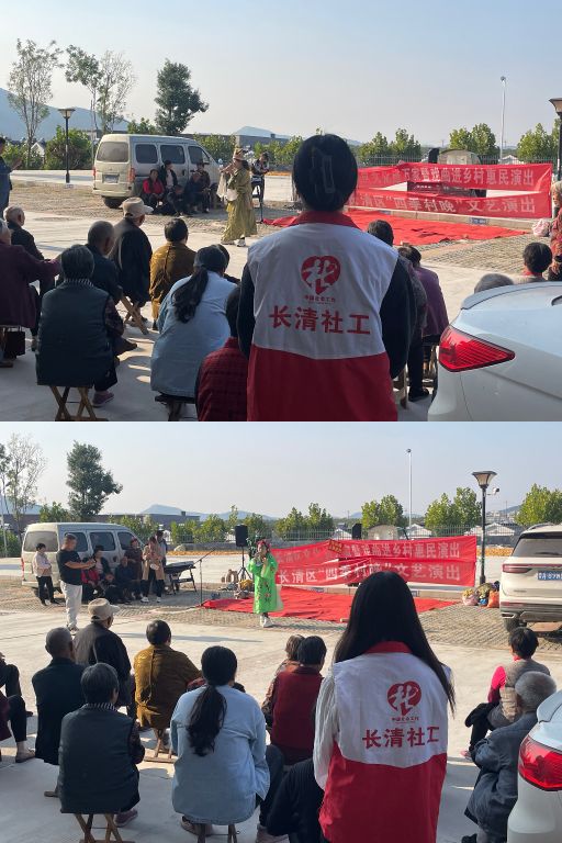 春风化雨,以文化人,活动中,黄梅戏《女驸马》选段、《唐伯虎点秋香》、《对花枪》选段等10余个形式多样的精彩节目轮番上演,连续两日为老年人献上了种类丰富、表演形式多样的文化惠民演出,让大家在家门口就能欣赏到精彩的文艺节目,演员婉转悠扬的唱腔,惟妙惟肖的表演,让在场老年人连声叫好,不时爆发出阵阵掌声,活动现场不仅仅只有老年人,还吸引来很多社区居民。为烘托活动氛围,社工以及志愿者积极与老年人进行互动,在本次活动中老年人以戏曲为切入口,在两天内彼此之间的了解增多,因戏曲而结缘,里面还有熟悉的老年人面孔,此前参加过社工站开展的活动老年人亲切地与社工打招呼。文艺演出结束后老年人表示:“非常好!”;老年人赞不绝口:“还是爱听咱们中国的传统戏曲,有味道啊”,大大提升了老年人的幸福感和获得感,体会到乡土文化特色。
