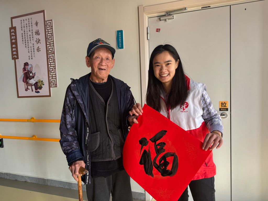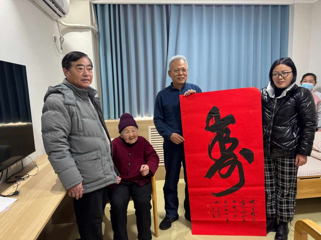 无联不成春,有联春更浓。书画家们以笔寄情、以字传情,将美好的祝愿融入春联与福字之中。一幅幅饱含吉祥寓意的作品跃然纸上,传递着浓浓的年味与温情。随后,社工站的志愿者们将这份心意逐一送到老人们手中,其中,一位99岁高龄的老人成为了活动的焦点。区民政局副局长曲延璟与马山镇民政所所长赵辉一同将精心书写“寿”字送到董奶奶手中,并亲切地询问她的身体状况和生活细节。董奶奶脸上洋溢着幸福的笑容,对大家的关怀表示感谢。