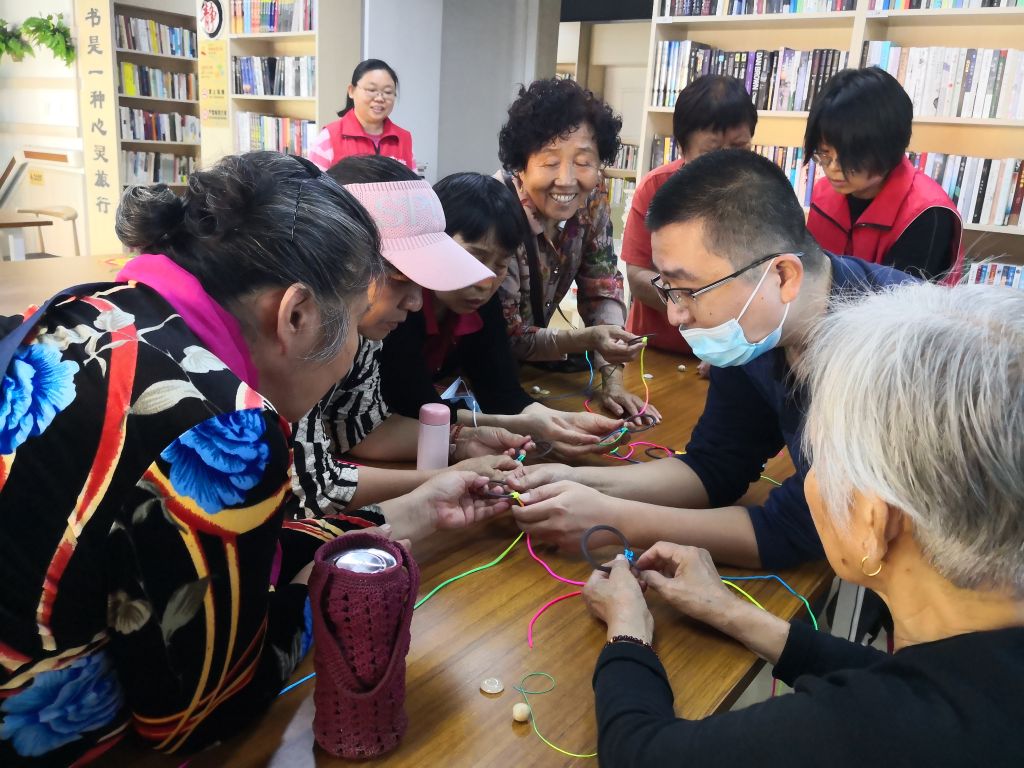 社工特别邀请了南村街道残疾人匠心首创手工创业联盟的韩锋老师担任本次手工编织的指导老师,与韩老师共同准备了活动物资。为了老人们的安全着想,社工们提前来到约定地点,带领老人们一起来到泉城书房二楼。韩锋老师讲解仔细、耐心教学,社工们也与老人们共同编织寓意平安、健康、顺心的挂件,笑在一起、乐在其中。最后,每位到场的老人都亲手完成了一件作品,非常有成就感,大家一起拍照留念。