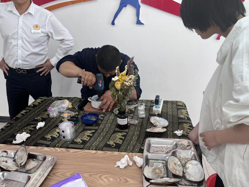 活动开始前,王舍人街道社工站的社工早早来到活动现场,准备好珍珠蚌、珍珠打孔机、钳子、鱼线、托盘等物品。
