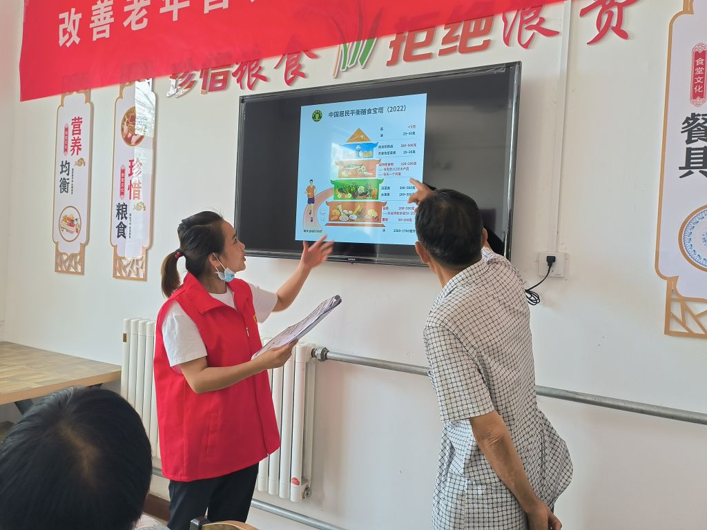 接着,社工组织老年人观看老年健康教育系列科普视频,视频包括老年人营养膳食、老年人心理健康等。随后,向老人们发放了“中国居民平衡膳食宝塔”宣传彩页,并采取图文结合的方式,以通俗易懂的语言向老年人介绍《中国居民膳食指南(2022)》中一般老年人膳食指南、高龄老年人膳食指南等相关健康知识,并现场回答老人提出的问题。