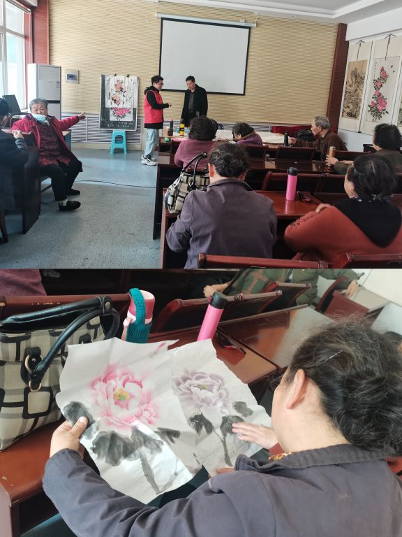 持毛笔下手轻重有一定的讲究,毛笔沾染的水也要适当,颜色深浅要有把握”在国画课堂上,志愿者老师为了加深学员们对画画的理解,现场为学员们详细简介了运笔、用墨、构图及色彩调配等具体作画技巧,学员认真聆听,互相交流,在画中学、学中画。