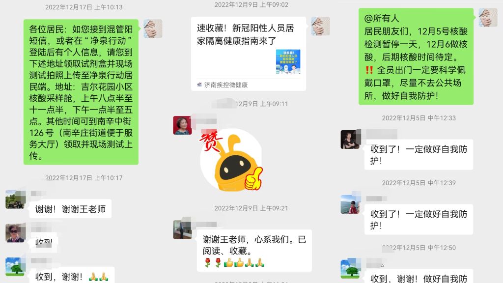 以前的问候“吃饭了吗?”当前的问候“你阳了吗?”。不难看出在病毒面前,我们所有人都要接受这样的考验,服务对象眼中能干的我们也经历了“阳”,面对病毒的疯狂传播,无论大人还是孩子,无论老人还是青年,它都是一样的公平对待。在此情况下社工站通过线上服务平台,对服务对象进行正确引导及宣传,让居家的服务对象感受到社工的用心服务,从最初的核酸检测暂停、无特殊要求尽量不参与核酸、非必要不出门、“净泉行动”小程序的使用到大家基本躺平后引导服务对象规范有效到指定地点领取抗原试剂盒到最后“阳了”什么情况去医院、“乙类乙管”,使服务对象第一时间根据自身状况“对症治疗”。