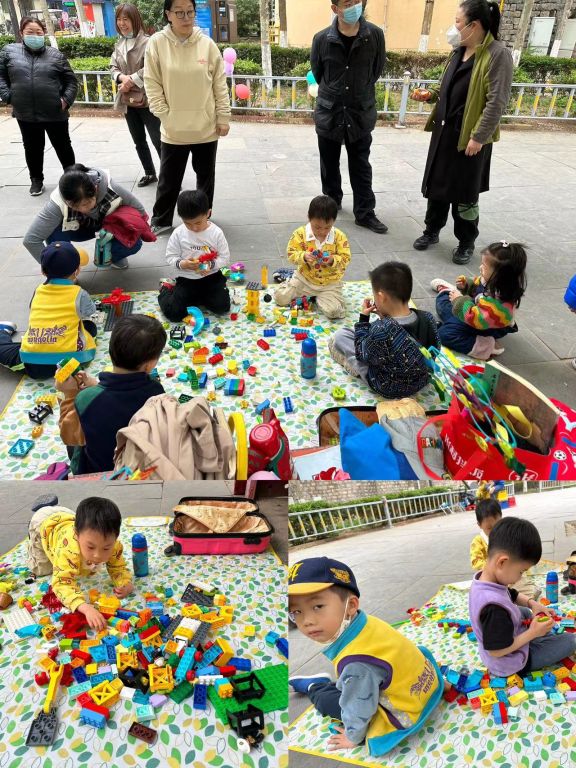 在活动延伸中,社工组织幼儿和家长们以游戏的形式拼搭我眼中“社区的春天”,孩子们每说出一种关于颜色的成语,就可以得到一块乐高积木去搭建。通过乐高加深孩子对“颜色”这类成语的理解和运用,同时也提升了亲子亲密度。