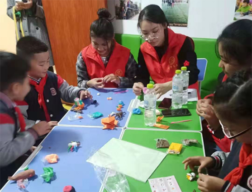 孩子们一放学,就陆陆续续跑到手工课堂教室,看到彩色的卡纸和橡皮泥,兴奋不已。志愿者耐心为孩子们答疑解惑,并一遍一遍的为孩子们演示手工制作过程,确保每个孩子都能学会。针对孩子们的想象力和创造力,还开设自由发挥和作品展示讲解环节。