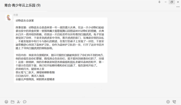 当清脆课铃在家中响彻,褪去了以往的亲密与互动,多了几分系统和严谨,似乎在这过程中焦虑感、紧张感便慢慢滋生。虽然社会工作服务达不到治愈心灵的成效,能够通过社会工作服务得到短暂心灵休憩也是提供服务所产生的成效了,因此青年公园街道社会工作服务站(青合站)创新服务设计,将历奇服务寄与云端,以破解迷案为主题为辖区儿童建构一场新奇、烧脑的冒险之旅。简易俗套的故事剧情搭配曲折离奇的困难谜题,借助微信群和文字搭建新奇的游戏世界,抛离寓教于乐,还原更为纯粹的游戏快乐,用幼稚的语言勾勒一个奇妙世界,用扑朔的谜题撩拨那紧绷的心弦,闯入动物森友会的世界迎接社工脑洞下的奇妙物语。