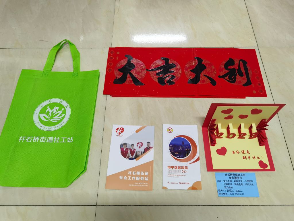 活动当日,社工们将一幅幅吉祥如意的春联以及社工站的宣传折页、民政政策宣传折页、新年贺卡、便民服务卡等物品打包成一个个新春礼包,按照提前规划好的走访路线,带着美好的新春祝福,开启了此次探访送温暖服务。