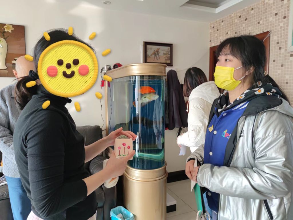 绿植装点生活,互助志愿促成喘息服务。征集指尖生花手工志愿服务队成员制作的盆栽后,社工来到锦绣城社区困境人群家中入户探访。社工综合运用倾听、澄清等社会工作实务技巧为服务对象提供直接服务,关注服务对象的生活近况,关怀服务对象的精神需求,将志愿者制作的盆栽和祝愿赠送给服务对象。收到盆栽后,服务对象都表示很喜欢,绿植的生机盎然绿植装点着他们的居所,也点亮了他们的心灵。
