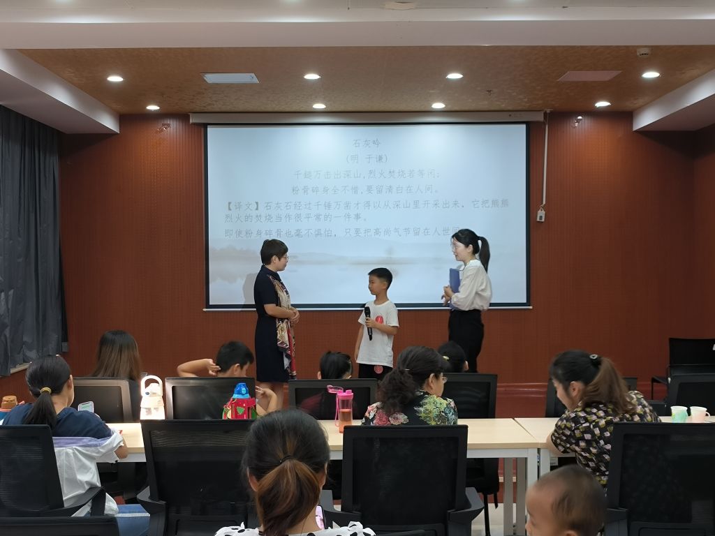 共读经典,文化润心。活动首先游戏“清风吹”活跃气氛,引导组员融入到活动中来。在亲子共读经典环节,家长与孩子一齐上台,诵读《墨梅》《咏煤炭》与《石灰吟》等廉洁经典,共同品悟“粉骨碎身全不惜,要留清白在人间”、“清心为治本,直道是身谋”等佳句中蕴含的廉洁奉公、奉公克己的高洁品行,用中华优秀传统文化陶冶孩子爱廉助廉的道德情操。