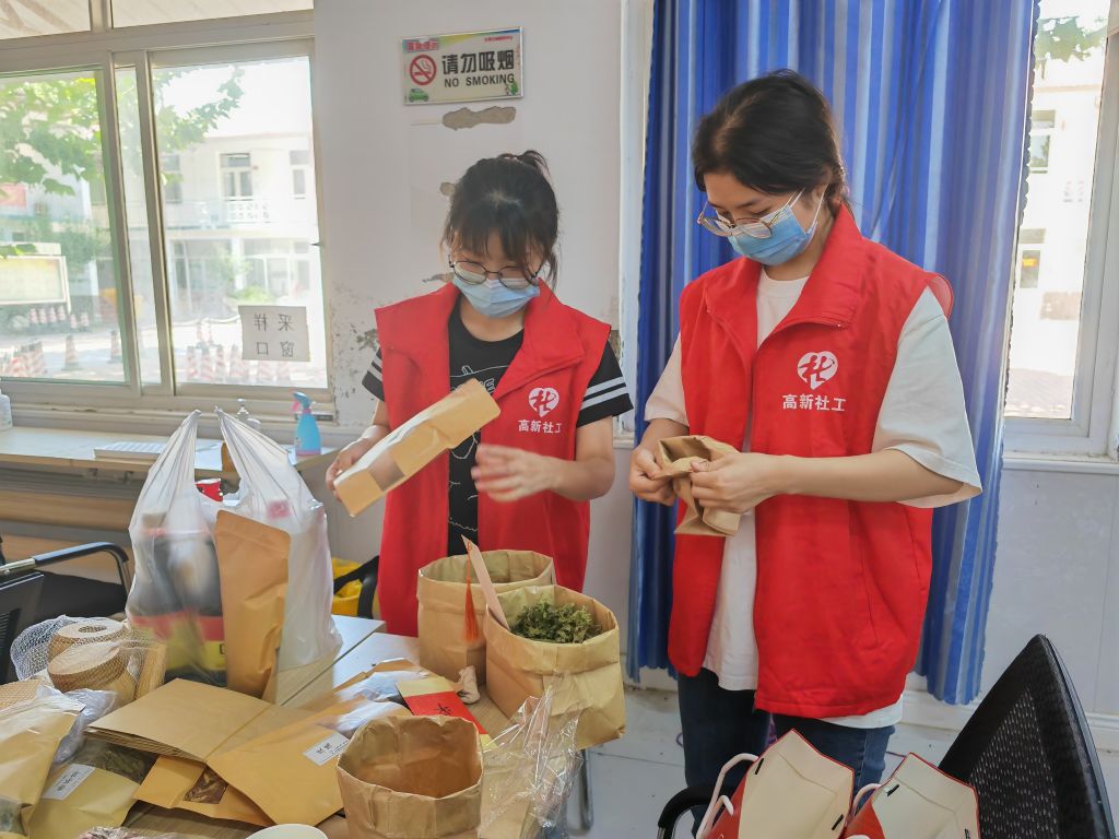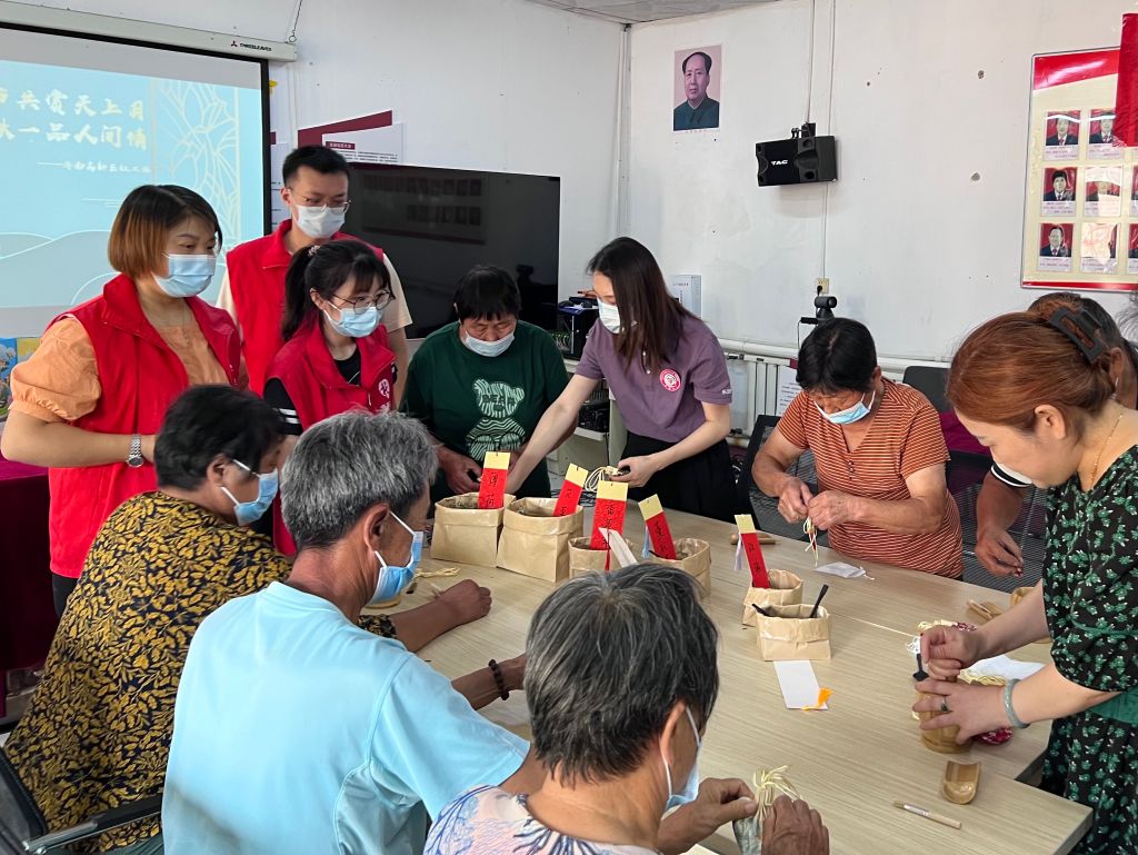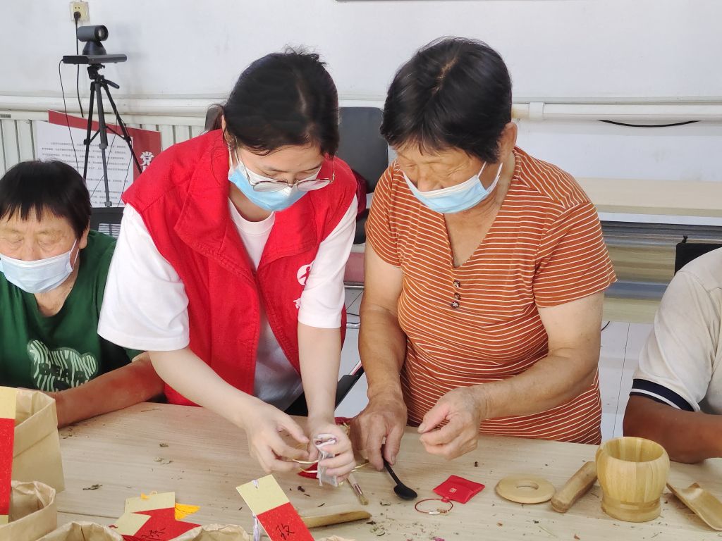 在“巧手做香包”环节中,老人们挑选了自己喜欢的香包并由社工向老人们介绍每种香料的功效与作用。香料置于木臼中,木杵翻飞;巧手封装香包,香气四溢。随着活动的推进,一个个造型精致的香包陆续被制作出来,看着手中的“劳动成果”,老人们脸上浮现出开心的笑容。