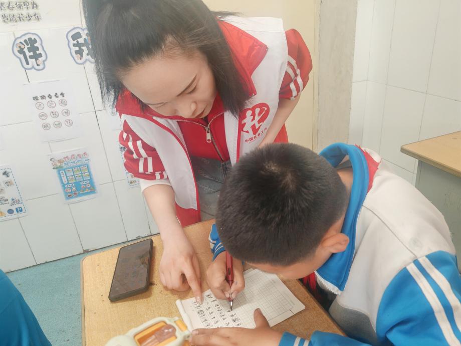 在书写过程中,社工穿梭于孩子们之间,不仅在书法技巧上给予鼓励和帮助,更关注他们的情绪状态,适时给予心理支持与陪伴。每完成一幅作品,孩子们的脸上都洋溢着自豪与喜悦,现场气氛热烈而温馨。