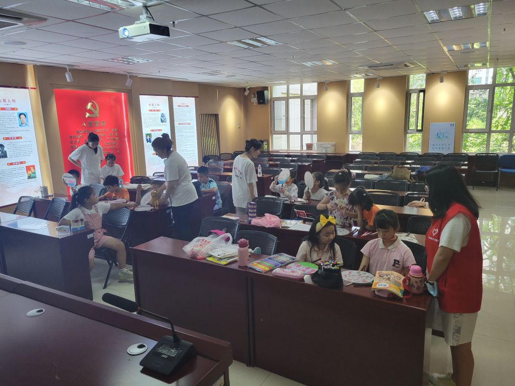 炎热的天气无法熄灭孩子们的热情,活动还没开始,孩子们和家长都早早的来到活动室,坐无缺席。而社工早已在桌上为孩子们精心准备了空白扇子、五彩缤纷的颜料和种类齐全的绘画工具。活动一开始,孩子们在老师的指导下,拿起画笔,以饱满的热情投入到扇子的绘画当中,一会儿,一幅幅充满创意的扇子画在孩子们的笔下形成。一把把扇子瞬间变得缤纷多彩、妙趣横生,让炎热的天气凉爽起来。整个活动现场弥漫着浓厚的创作热情和小朋友们欢快的笑声。