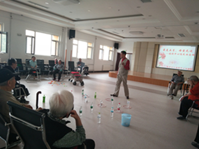 福利中心20余名老人欢聚一堂,共同度过了难忘的母亲节。整个活动以游戏和表演为主,设有夹乒乓球、套圈、你来比划我来猜、投球、钓鱼等游戏环节,老人们分给5个小组,自由选择自己喜欢的游戏进行娱乐,社工从旁讲解游戏规则和负责协助老人。表演环节则由志愿者给老人带来山东快板和歌曲演唱等节目。活动最后,社工送给老人们亲手制作的母亲节贺卡,此次活动在一片欢声笑语中结束。