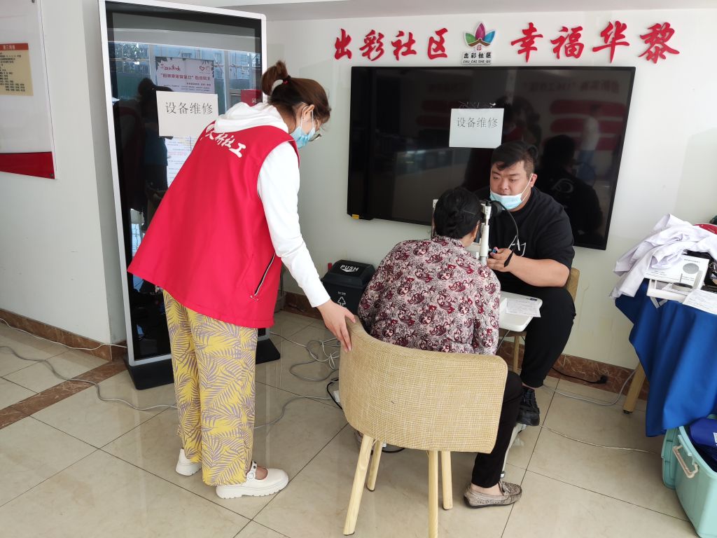 活动现场,社工引导居民有序排队参与检查,保障了筛查现场井然有序。眼科医生利用专业仪器为辖区老年人进行了白内障检查和诊断,就每位居民的眼睛情况提出针对性建议,并解答居民提出的各类眼科问题,同时为居民们普及了白内障相关知识和保护眼睛、保护视力的方法,提醒居民要在日常生活中加强预防、养成良好的用眼卫生习惯。