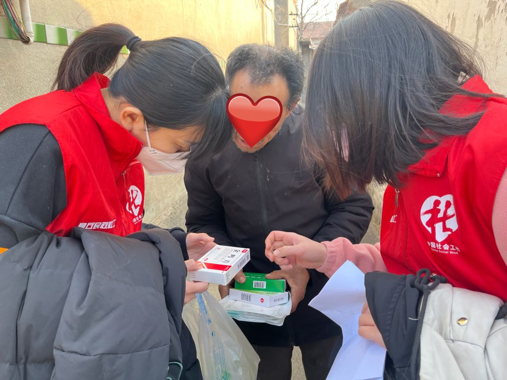 社工和村干部一起走到吕家村五保老人徐大爷家,大爷家屋子里面很黑,却异常干净整洁,小小的屋子里东西摆放的井然有序。老人没有亲人,见到我们格外热情,与徐大爷的交谈中,我们了解到徐大爷患有老年人常见病,常年吃药。社工们给徐大爷讲解了预防疾病的小常识,送上了感冒药和N95口罩,并耐心讲解药品的用法用量,徐大爷表示:“现在的生活越来越好了,感谢党和政府,感谢你们一直记挂着我”。随后我们又走访了几户五保老人,给他们送上了感冒药和N95口罩,对他们存在的困难及时进行了记录,为后期的跟进服务做好了充足的准备。