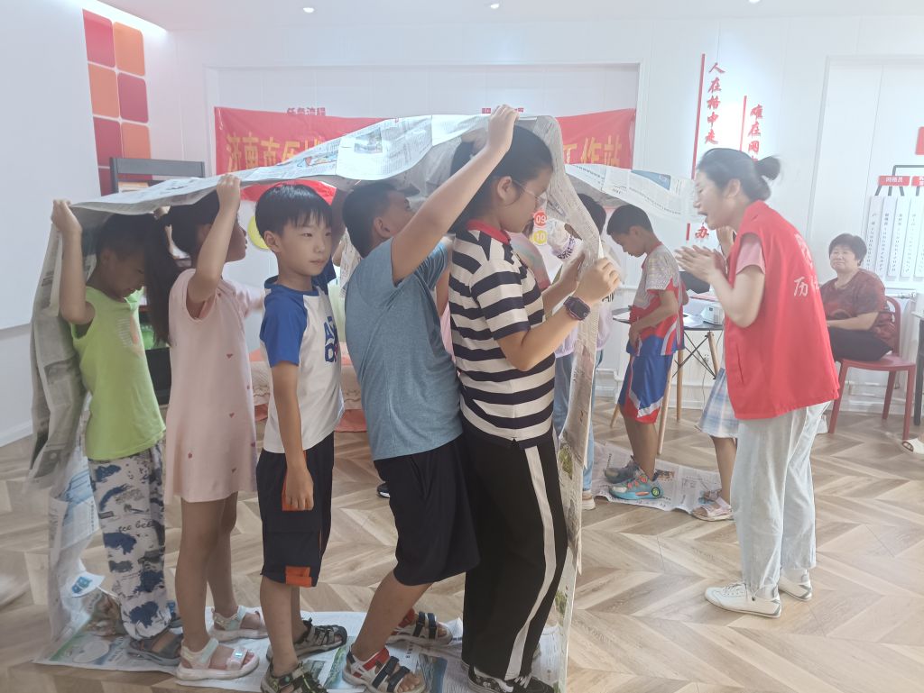 接下来的“无敌风火轮”游戏中,社工将青少年们分成两个小组进行竞技比赛,大家分工明确,有条不紊地将废弃报纸组成了一个“风火轮”,在小组共同的努力下“风火轮”立起来了,小组同学快速的钻进报纸制的“风火轮”里往前行进。通过这个游戏期望培养青少年们密切合作、克服困难的团队精神以及增强青少年之间的相互信任和理解。