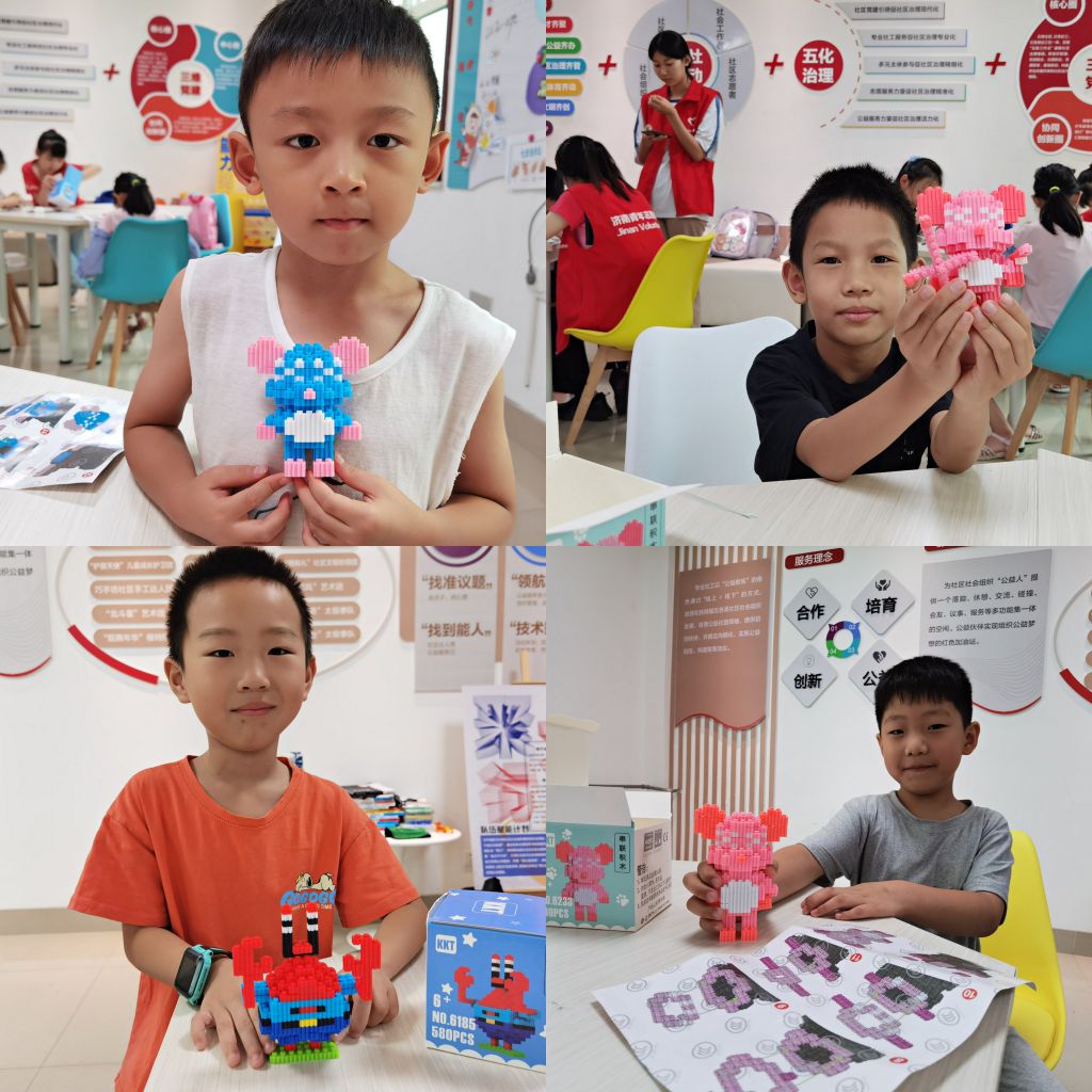 搭建乐高就是观察、拼搭过程的反复,但这个过程并不是机械的反复,而是需要营员们仔细观察,小心拼搭,在不断解决问题中反复,直至将模型搭建完成。在搭建的过程中,社工通过引导营员们自主结对子,团队独立自主解决困难。在不断地探索中加深了沟通,搭建了不同的模型,有可爱的“蟹老板”、“冰墩墩”、“可爱熊”等等,琳琅满目,从一张张认真思考的小脸可以看出青少年们完全沉浸在拼乐高的趣味之中。