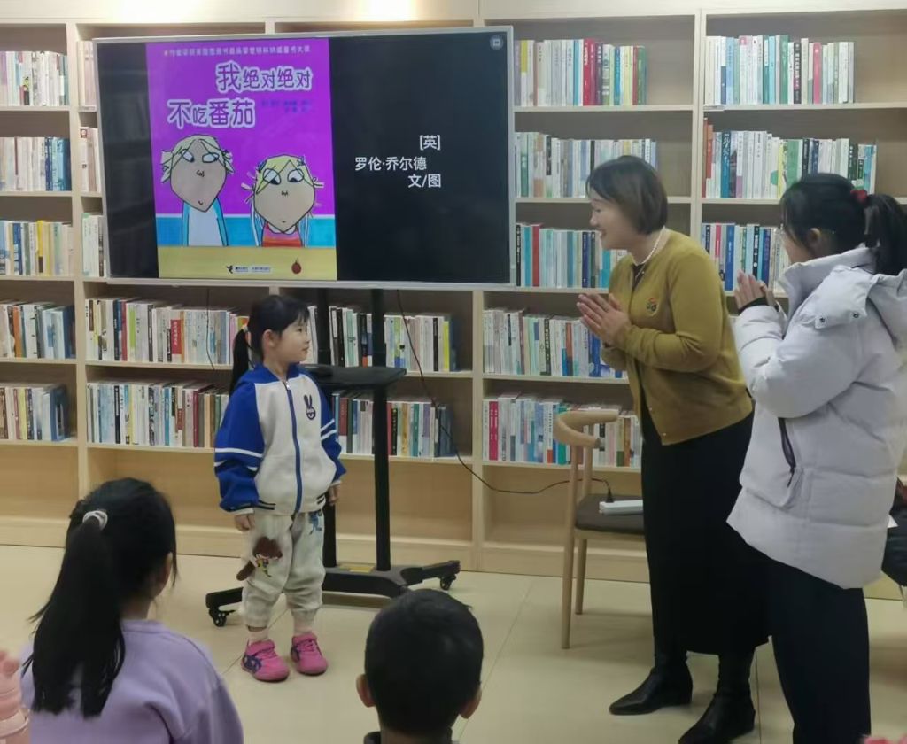 活动当天,社工邀请了专业的绘本讲师为孩子们带来了绘本故事《我绝对绝对不吃番茄》,讲师声情并茂地讲述了主人公哥哥查理哄挑食的妹妹劳拉吃食物的故事,生动有趣的故事情节带动了孩子们的好奇心,他们听得特别专注。当看到故事中把食物描述成各种新奇有趣的事物时,一幅幅精美的插画使孩子们的想象力被瞬间展开。讲师通过互动提问回答,引导孩子们一起观察和思考,带领孩子们进入一个充满奇幻色彩的绘本世界。