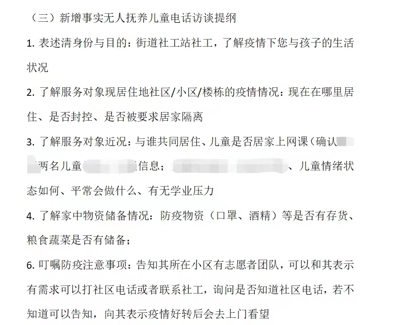 2022年11月中旬,济南再一次被疫情包围,为了解辖区内部分老年人、困境儿童近期生活状况,建新社工站决定开展“初冬送暖”行动,对辖区内重点服务对象进行电话访谈。为更好地了解服务对象近况,社工站内部首先拟定重点服务对象名单,随后将名单按照其共有特征分为三类,分别拟定出不同类别群体的访谈提纲。