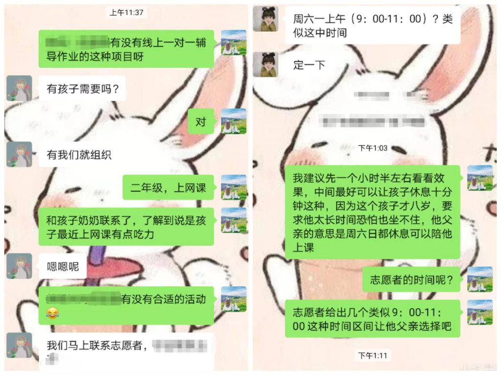 在访谈中社工也了解到由于学生现在都在上网课,部分服务对象存在学习效率低的问题,尤其是有位服务对象的奶奶表示,为了提高服务对象的学习效率,未被封控前自己会陪着服务对象上网课,协助服务对象记录疑问并在课后请教老师,但现在自己被封控,8岁的服务对象和父母在一起住,服务对象父母是聋哑人,无法协助其上网课,服务对象自己上网课时遇到听不懂的总是会自责着急。社工了解到该服务对象这一需求后,首先安抚奶奶的情绪,随后社工联系到历下区未保中心希望能够得到线上一对一辅导资源的帮助。在历下区未保中心的协助下,社工最终链接到大学生志愿者资源,为服务对象提供每周一次的线上辅导服务。