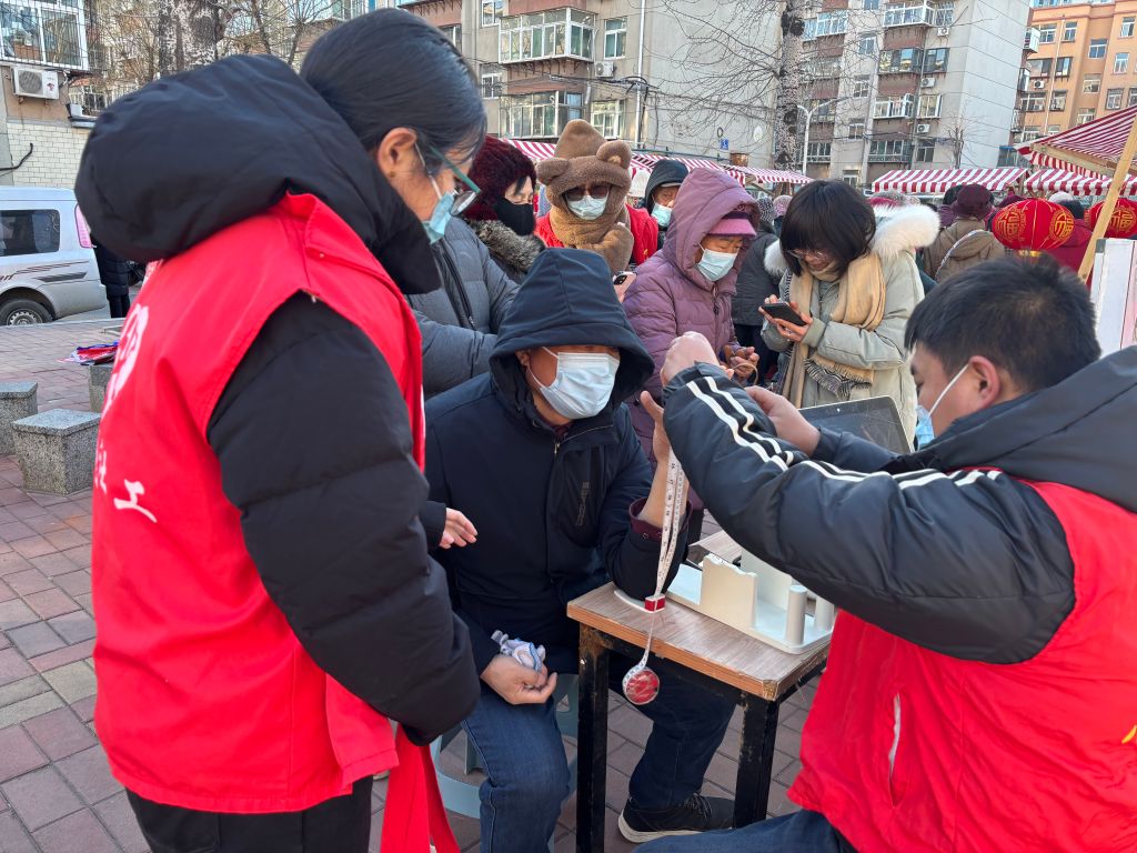 一大早,活动现场人头攒动,居民们热情高涨,每个服务摊位前都站满了人。义诊摊位前,医生们为居民发放健康宣传手册,免费测量血压,把脉问诊,测量骨密度,做眼部检查,让居民们实实在在地享受到了优质的健康指导服务。现场还有助农产品销售摊位和非遗摊位,丰富的地区特产与精美的非遗制品吸引了不少市民的围观和购买。社区李阿姨向社工表示,“这次来集市上买了不少好东西,还做了个身体检查,真是方便极了。”