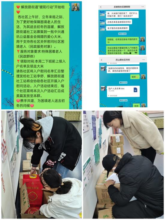 事预则立。解放路街道社工站在收到爱心大米的第一时间就联合各社区商讨暖阳行动,根据大米数量和社区具体情况进行自愿认领。各社区也积极回应,汇总整理好入户名单后,及时发送给社工站并由社区工作人员前来领取爱心大米。社工站将会协助各社区开展入户慰问活动,为困境老人送去暖心的初冬问候。