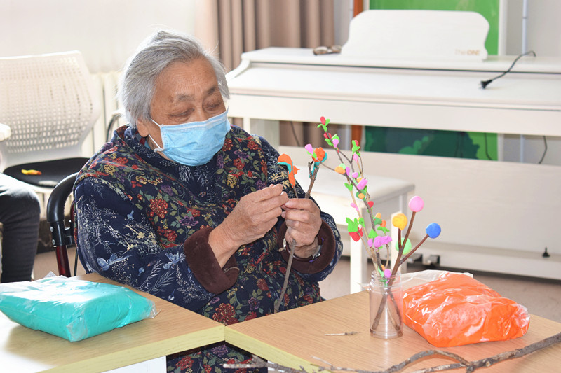 社工为老人们提供各色超轻粘土,鼓励老人发挥自己的想象,并在需要时为老人提供帮助。“七彩花”、“干枝梅”、“金银柳”、“桃杏花”、“紫腊梅”......各色各样的花纷纷在老人们的手下绽放,和花一起绽放的,还有老人们的笑脸。