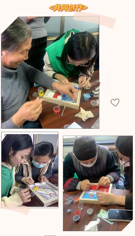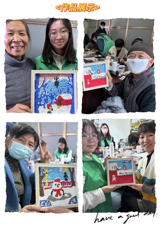 以手造物,以物寄情。来到冬季节气纸浆画正式制作过程,社工将纸浆、镊子、画框等材料包分发给老年朋友们,为大家讲解了纸浆画的原理,并让老年朋友和大学生志愿者两两一组,共同创作。志愿者们暖心陪伴、协助制作,老人们积极回应、乐心交谈,现场其乐融融,不一会儿,一副副生动立体、独具“浆”心的冬日节气纸浆画就呈现在大家面前。