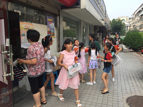 上午九点,社区老年人领袖们便早早来到了活动地点,告知孩子们分发社区报应当注意的事项,为孩子们分发报纸,佩戴志愿者袖章。领到报纸后,孩子们都兴奋的排着整齐的队伍来到小广场,礼貌地为路过的叔叔、阿姨、爷爷、奶奶送去报纸,收到报纸的居民都开心地称赞小志愿者们。之后,社区老年人领袖又带领孩子们在社区内的商铺发放了报纸,活动的过程中,老人们不住地提醒孩子们要懂礼貌、注意安全。小小志愿者们的身影在社区内穿梭,俨然成为社区内一道亮丽的风景。