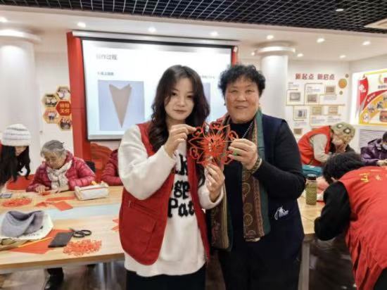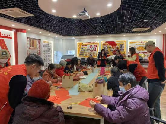 在社工的引领下,居民们纷纷拿起铅笔在红纸上画出各式各样的图案,接着拿起剪刀进行修剪,没一会儿,一幅幅剪纸作品就诞生了。亓阿姨拿着自己的作品高兴地给社工说:“我们剪出来的这些不仅展示了剪纸艺术的魅力,更传递了环保的核心理念,通过你们这个活动也激发了我们对环境保护的热情,也想对环保事业尽一份力!”