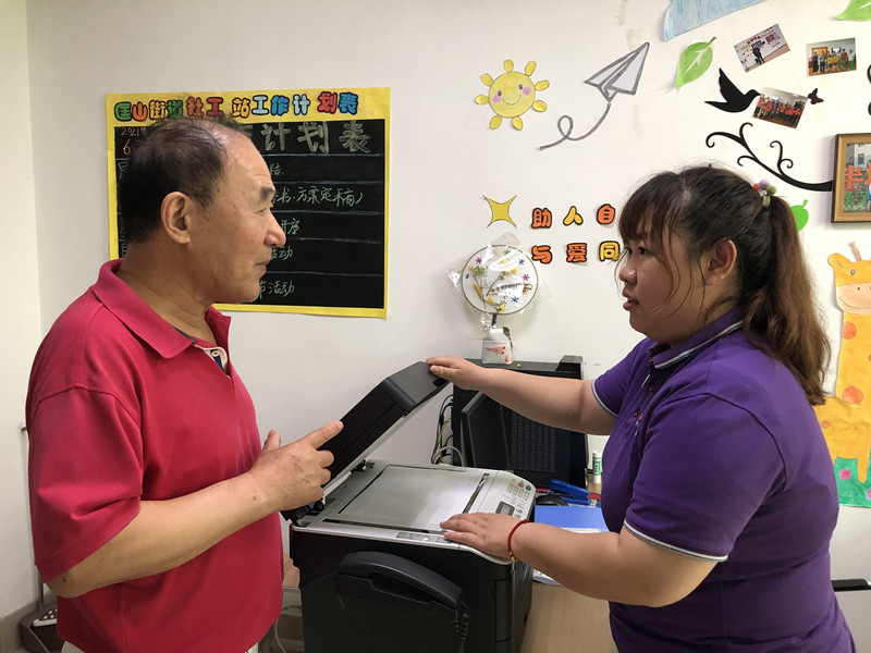 面对来自社区居民的求助,匡山街道社工站迅速回复了社区居民H求助信息,表示社工可以提供帮助,解决他眼前的困难。在与社区居民H交流中,得知社区居民H要去办房产证,需要提交一些身份证等复印件材料,因附近没有打印店且自己也不知道如何复印一些相关材料,所以想到来社工站向社工寻求帮助,解决自己此刻的困难。社工听到居民H的诉求,帮助他复印了有关房产证需要提交的材料,并暖心叮嘱居民H保管好复印材料,有任何不明白的地方发微信告知。