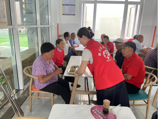 中午,志愿者组织养老院老人在餐厅有序就坐,并细心地为每位老人盛好饭菜,逐一端上餐桌,让他们享受新鲜可口的午餐。同时,社工也时刻关注老人的饮食,与老人亲切交流,倾听他们的意见,进一步提升服务质量。