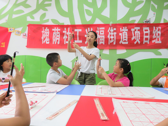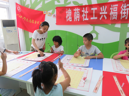 暑期夏令营活动的开展,还吸引了两名初中志愿者的加入,此次“墨香兴福”书法小组活动中,两名志愿者协助化珑瑾对学员的练习进行指导与鼓励,为小组活动注入了新的活力,促进了奉献、友爱、互助等志愿精神的弘扬与发展。项目组期待更多志愿者的加入,并将继续努力,不断完善社工服务,促进社工服务的持续与发展。