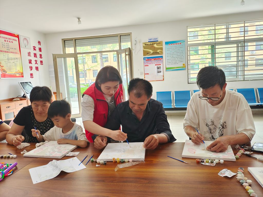 社工讲解完后,大家迫不及待地拿起画笔,蘸上颜料,一笔一笔地在画纸上描绘着,横着画、竖着画、勾着画、点着画,专心致志的投入到创作中,尽情地体验着数字油画的魅力。