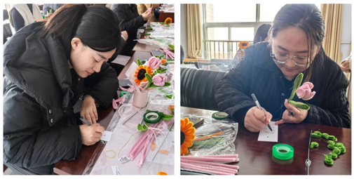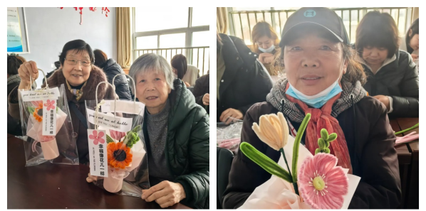 经过一个多小时的努力,一束束精美的扭扭棒花束在大家的手中诞生。这些花束不仅美观大方,如同春日里盛开的鲜花,更承载着参与者们的祝福与期望。活动结束后,大家纷纷展示自己的作品,并互相交流制作心得和感受,分享着收获的喜悦,仿佛每一束花都是她们心中最甜美的果实。
