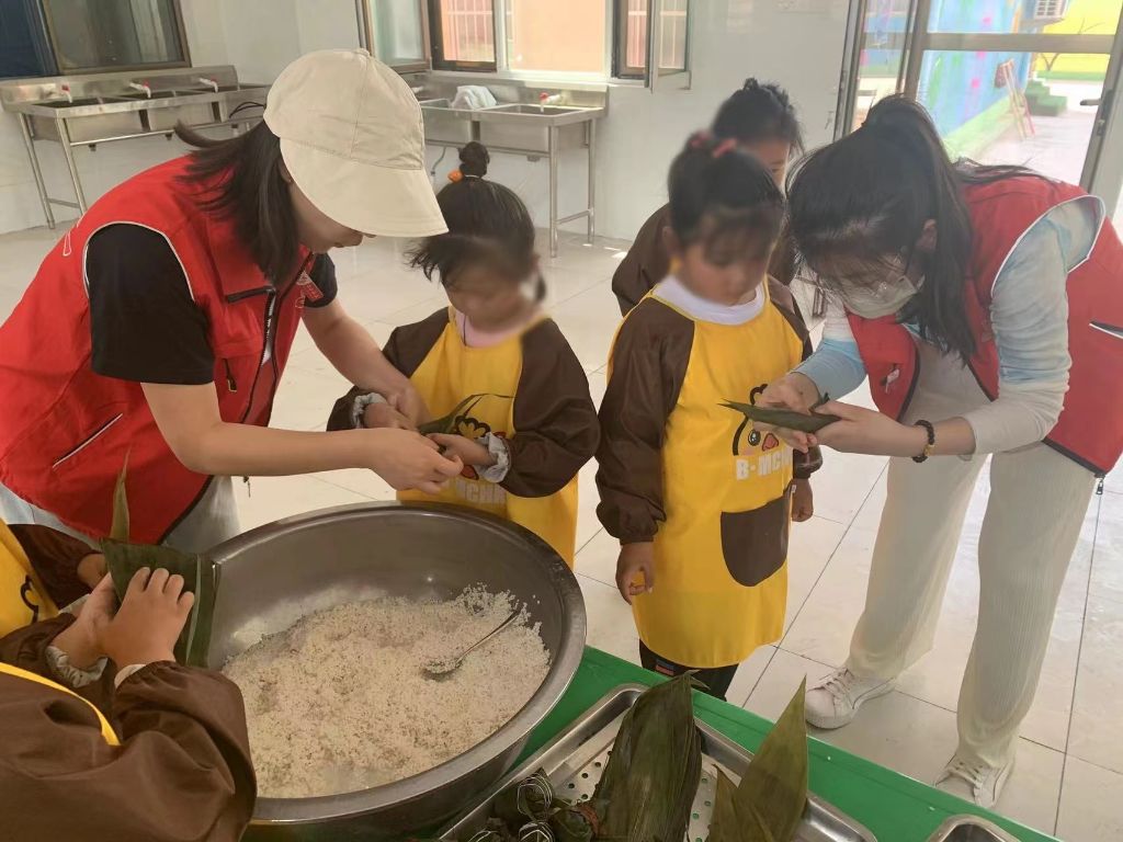 一走进幼儿园,就听见了孩子们欢声笑语的声音,顺着声音过去,一群可爱的孩子们正在排着整齐的队伍洗手、挂围裙。一切准备活动就绪后,社工们和老师们一起开始教孩子们包粽子,“小朋友,先把粽叶折成一个带尖尖的,像冰激凌的形状,再放糯米,把糯米包好用绳子捆紧咯!”社工们耐心的教着孩子们。“老师,老师,你看,我包好了!”4岁的小李同学在老师和社工的帮助下完成了人生中第一个粽子。