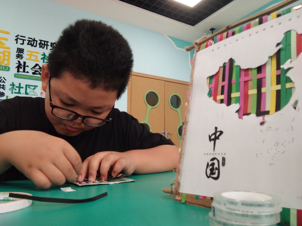 一幅色彩绚丽的底案,加上一张中国地图,祖国的颜色在青少年眼里是五彩斑斓,社工将中国传统文化与爱国之情融合在一起,清澈的爱只为祖国,少年强、则国强。爱国之情从年轻一代培养起!活动现场,社工向青少年讲解竹编悠久的历史和制作技术,并向其展示了几幅竹编作品。随着社工的讲解,青少年被传统技术深深吸引,感受着竹编的魅力。青少年们一边听得津津有味,一边感叹原来看似简单的竹编竟可以编织如此多的用具,都摩拳擦掌想要展示一下自己。出于安全考虑,社工以纸代竹,带领青少年进行纸编画,青少年们充分发挥自己的想象力,用自己稚嫩的小手,大胆选色,细心粘贴,用心编织, 经过半小时的制作,一件件精致的纸编画诞生了。大家相互分享制作心得,展示各自作品,脸上洋溢着开心的笑容,现场一片欢声笑语。