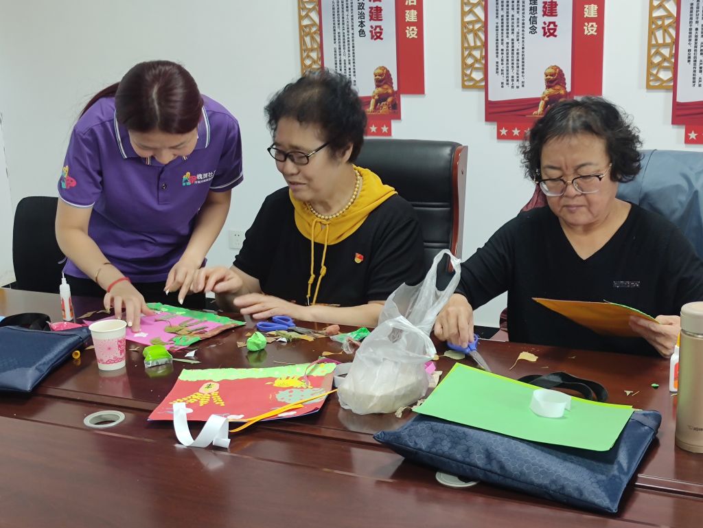 随后,在社工的带领下,社区党员们运用形色各异的树叶、卡纸、太空泥,制作属于自己的“丰收秋牛图”。树叶的叶梗自然翘起的弧度形成了惟妙惟肖的牛尾巴,而小一点的叶片则成为秋牛的两个尖尖的牛角,社区党员们运用自己的想象力耐心的拼凑自己的丰收图,丰收图中苹果树上挂满红彤彤的苹果、一束束麦穗闪耀着金黄光芒、祥云在天空漂浮,地面则是一番兴兴向荣的景象。“丰收秋牛图”不仅是作物的丰收,更实幸福、吉祥的丰富大丰收。