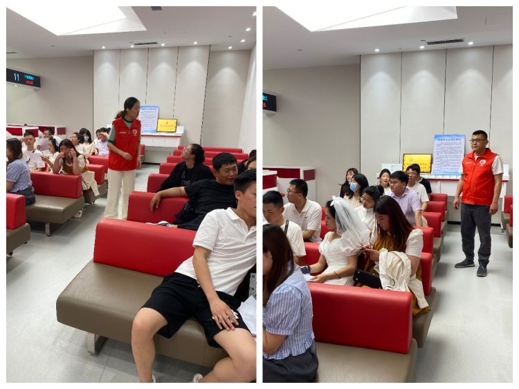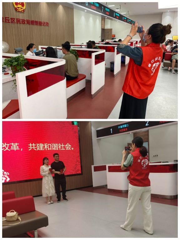 五位社工分工合作,从取号引导、秩序维护、复印资料到婚前辅导一条龙服务,有力保障了当日登记工作的顺利开展。她们不仅用专业知识为新人提供婚前辅导、心理咨询,同时倡导大家举办简约适度的婚礼,宣传“喜事新办、婚事简办”社会新风。