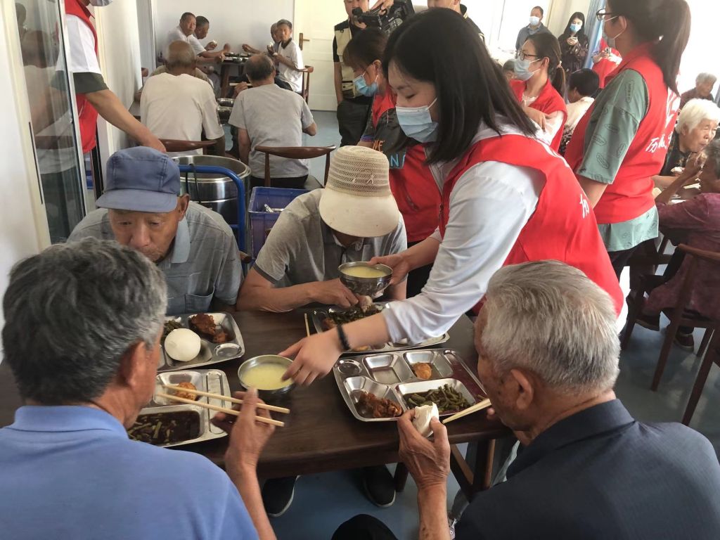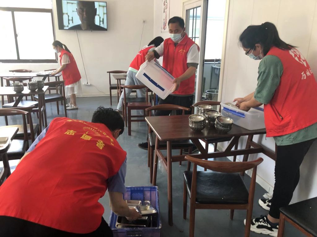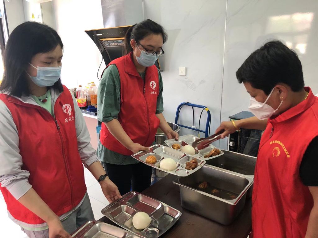 社工和志愿者们打扫卫生、清洗餐具消毒、整理菜品为老人们精心准备疫情后开放的第一餐。志愿者将“豆角炖肉、大鸡腿、卤鸡蛋”装盘、上桌;房间充满欢声笑语,气氛融洽和谐。