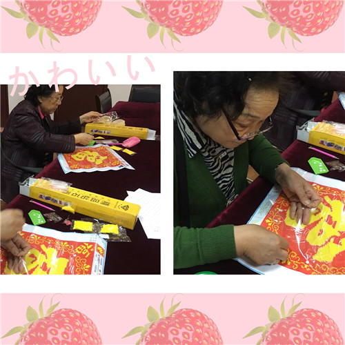 “立体十字绣原料包括三样:一是画布;二是钻,三是点钻工具一套。首先要做点钻准备,把画布平铺在平台上,揭开白色的面纸,可以看到一幅印有圆圈的图案,根据标示,然后找出图案中相对应颜色的钻。随后,拿点钻笔点起钻,找到相对应的颜色圈放上去。最后,用手在钻上轻压一下以增加钻和图案的粘合度。一定要耐心填充,按照圆圈的颜色顺序逐一地点上去。并不时检查完工的区域。看是否有遗漏或点错色的地方,重复操作就可以完成整个图了。”社工介绍着立体十字绣的画法和要领,听了社工讲的要领之后,大家紧锣密鼓的就开始制作起来了,在制作过程中组员你一言我一语,积极交流、相互帮助,整节小组的气氛愉快轻松。