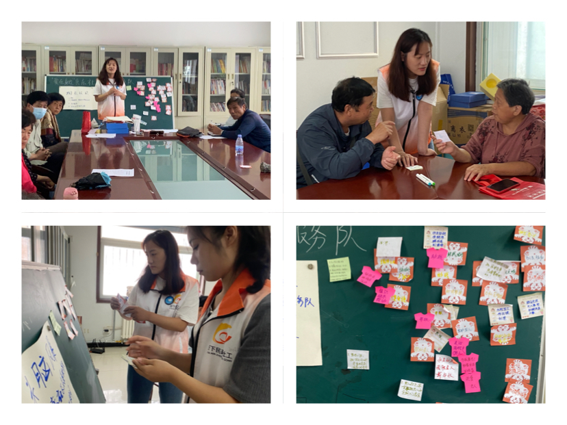 第二环节,团队成员就话题“我们队伍要开展什么样的服务”开启头脑风暴。大家在便利贴上写上自己认为队伍需要重点去做的服务,社工引导进行分类。经过头脑风暴分类,助老、助残服务、社区服务等团队服务内容跃然黑板上。在社工的引导下,团队成员达成共识后续针对此服务类型进行详细探讨,如为哪些老人服务、怎么服务、服务内容等。