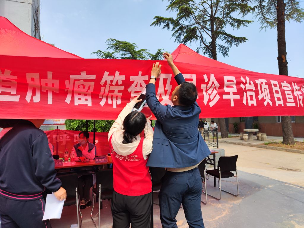 社工早早来到义诊现场,协助济南市莱芜人民医院的医生们张贴横幅、摆放桌椅、搬运检查设备。在参加义诊活动的居民到来后,社工引导居民依次进行登记签到,有序地排队进行检查。